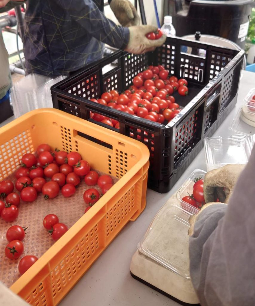 4/4に定植したミニトマトがいよいよ収穫開始となりました(6/10)これから毎日の収穫や管理が増えてきます。熱中症には気を付けて作業をします。 -
