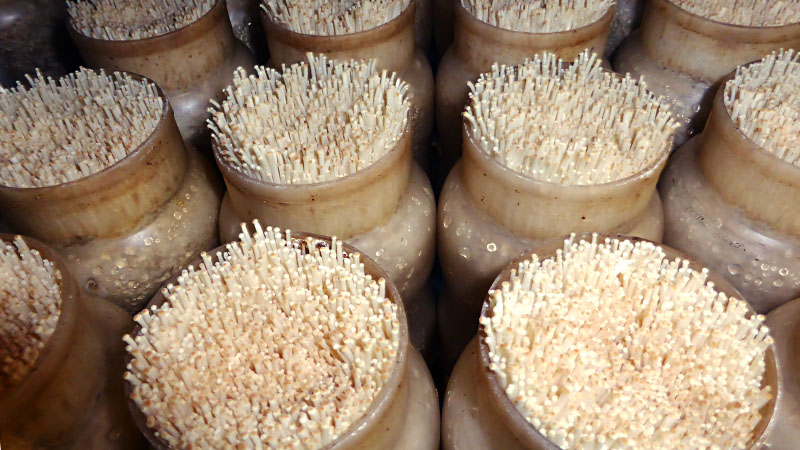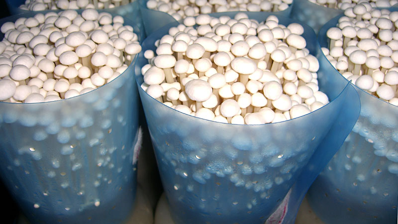 生育室で温度・湿度・光・空気を管理しきのこを発生させます。