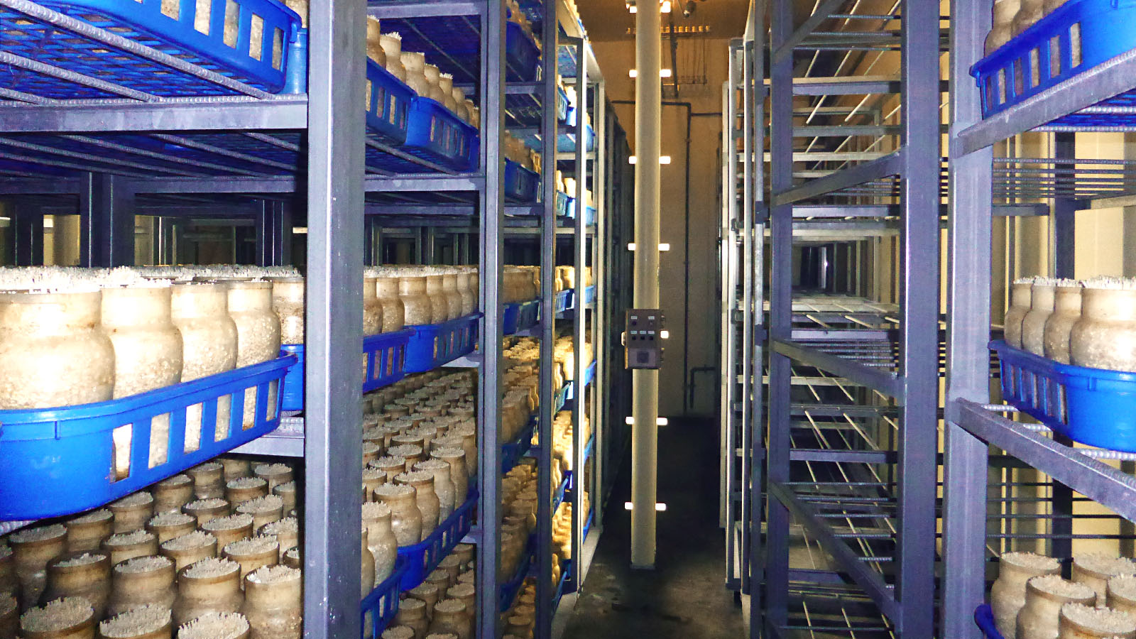 生育室で温度・湿度・光・空気を管理しきのこを発生させます。